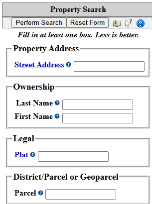 You may see a form with fields labeled Property Address, Ownership Last Name, Parcel, and optional filters.