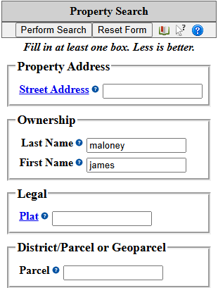 The find property by owner name feature scans the county ownership database and compares the entered text with recorded property holder information. The search form normally contains two fields: