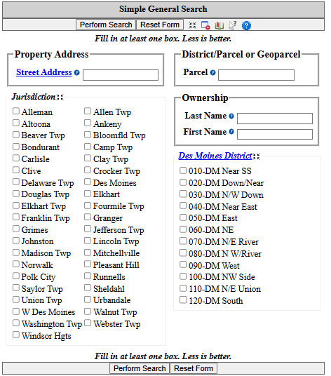 official address search form here: https://www.assess.co.polk.ia.us/cgi-bin/web/tt/form.cgi?tt=query/basic/simplegeneralform&help_state=1